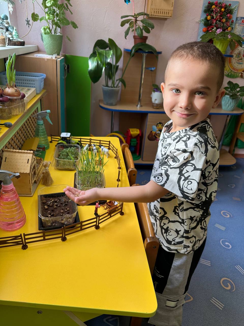 Дети активно участвовали в посадке огорода. Мы посадили лук, чеснок, пшеницу и горчицу, и с нетерпением ждут, когда появится первый росток.